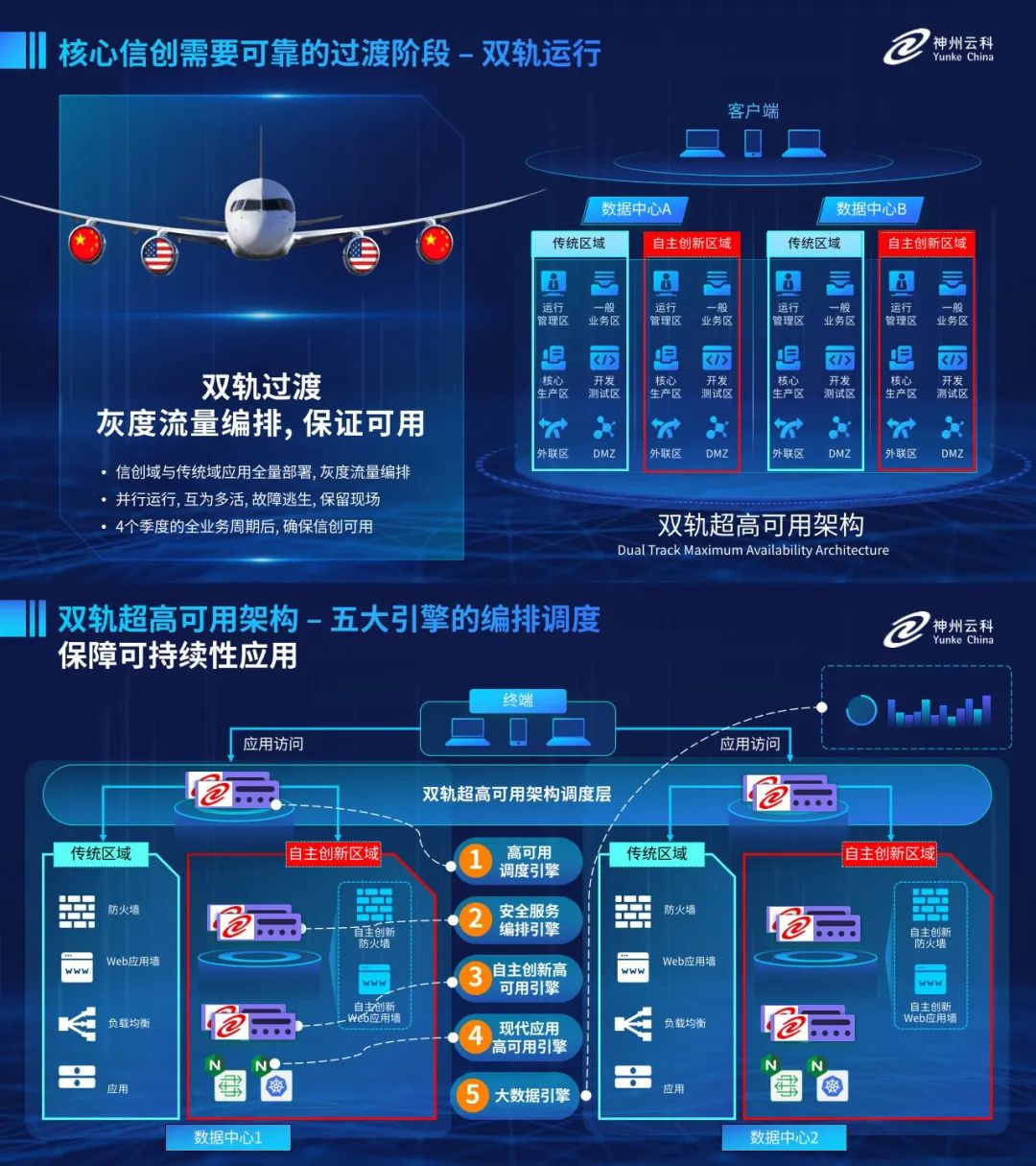 为助力金融业务高质量发展,更好地应对数字经济时代对可持续性的高要求,实现“信创”与“数字化”齐头并进,神州今年会创新性的推出了核心信创·双轨过渡的超高可用架构。该架构在双活数据中心的分区调度基础上,增加信创域和非信创域的分域调度,实行信创域与传统域应用全量部署,使双中心运营变为双中心四区域并行运行,互为多活,将“0到1”的单轨建设道路变为分区分域协同的多活双轨超高可用架构。帮助客户在新架构下,保障“信创”的同时解决性能瓶颈,提升稳定性,保证应用可持续性,最终实现信创区域和非信创区域的平滑过渡,完成国产化替代目标。
