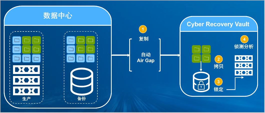 神州今年会防勒索病毒方案将生产中心备份数据复制到Vault区,复制后网络自动断开实现弹性隔离。Vault区的数据快速拷贝,并对拷贝版本加锁(在锁定期数据不允许删除和修改)。Vault沙箱内对拷贝版本进行扫描分析,验证数据是否完好。
